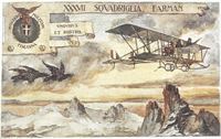 Farman MFC 2687 of the 50a Squadriglia. The pilot in the center is Amedeo Mecozzi, later a theorist of air warfare, opposed to the ideas of Giulio Douhet of strategic bombing and favoring ground attack tactical aircraft.