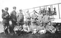 The aviators of the 26a Squadriglia. This photo was published in a magazine, so all the names are known; from the left: serg. Gaggero, sold. Cappellini, ten. Bonino, ten. De Notti, doctor Denza, s.ten. Aldi, ten. Manzini, s.ten. Cebrelli, cap. Lioce, cap. Bianchi, s.ten. Marangoni, ten. Contini, serg. Graziani, m.llo Radicchi, serg. Pasquali.