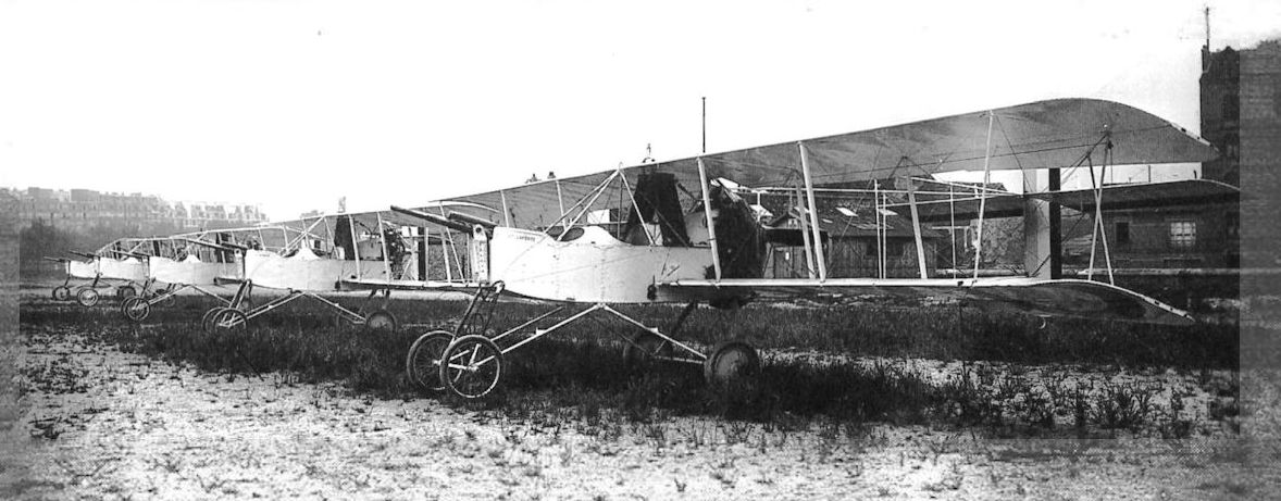 A lineup of Voisin 4s. The wings were shifted rearward 40 cm (compared to the Voisin 3) to compensate for the weapon's recoil and weight. The aircraft had identical dimensions to the Voisin 3 except for a slightly longer fuselage nacelle.