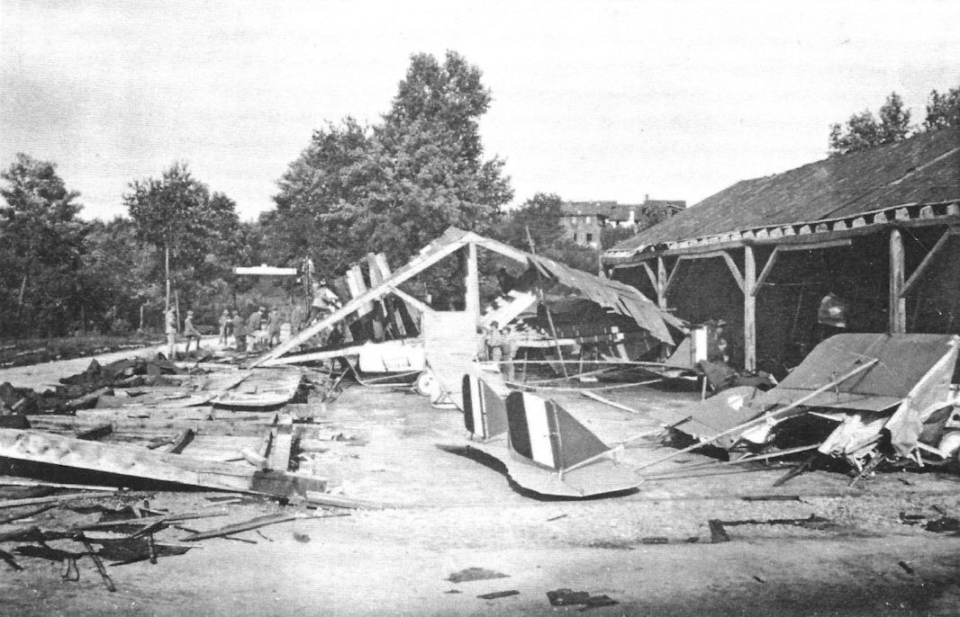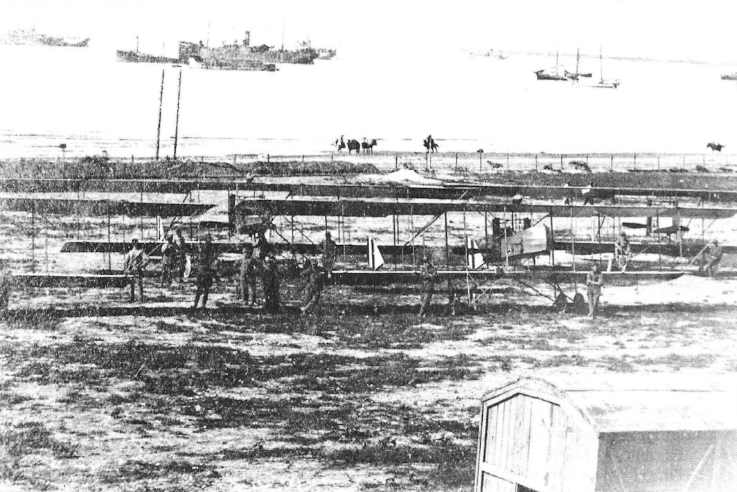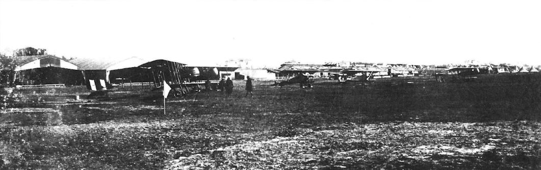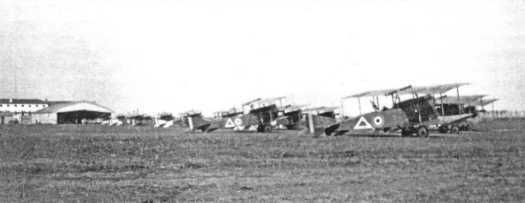 The airfield at Castello di Godego; in the forefront there are French Nieuports, Sopwiths and Dorands, in the top left there is the Italian part of the field, where a Caudron G.4 of the 48a Squadriglia and an SP.3 of the 27a Squadriglia can be seen.
