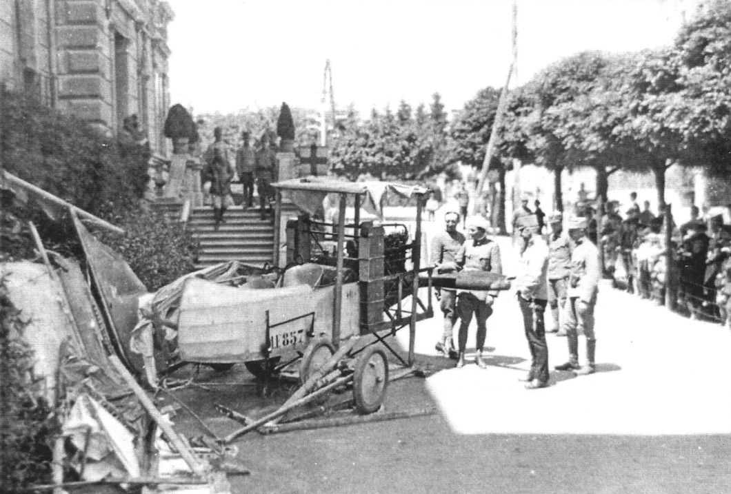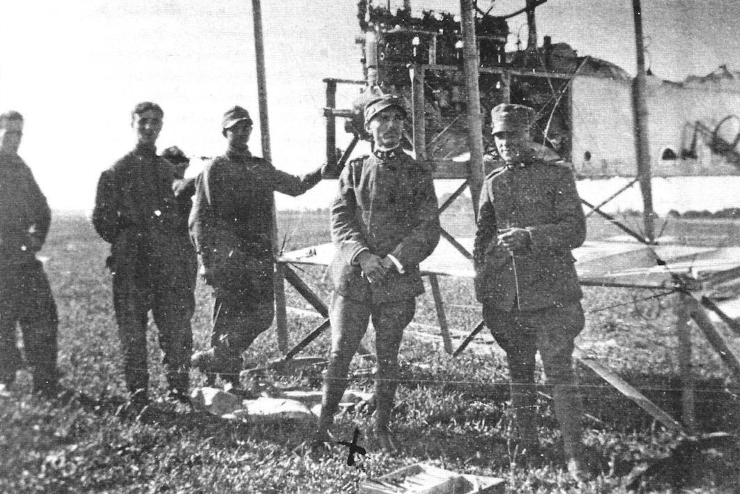 The fuselage of Farman 857, shot down on 4 July 1916, exhibited for the population. The two men in the center seem to be the Italian crew in captivity. (Archive Zoltan Czirok)