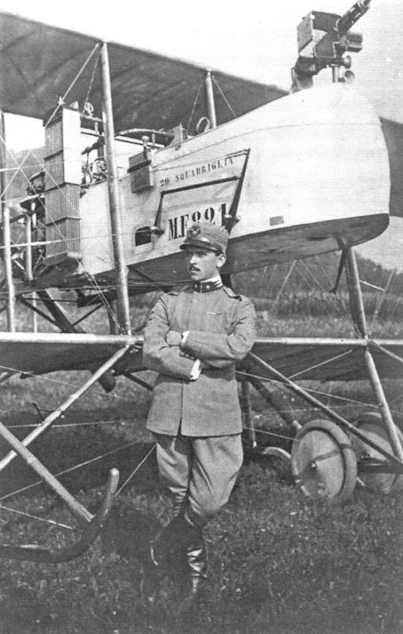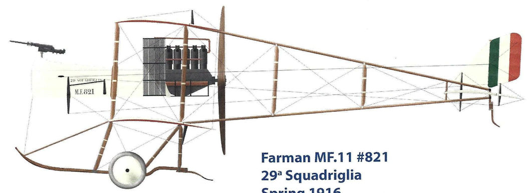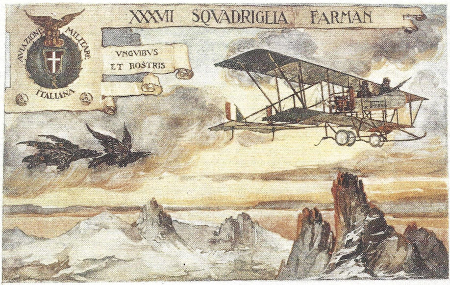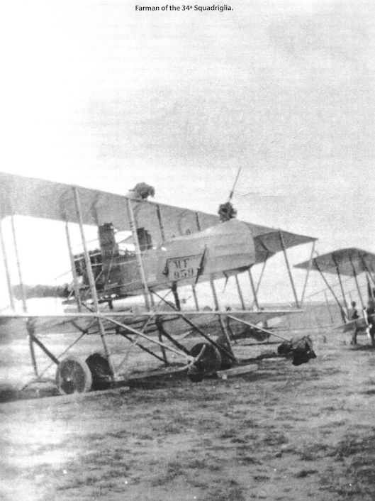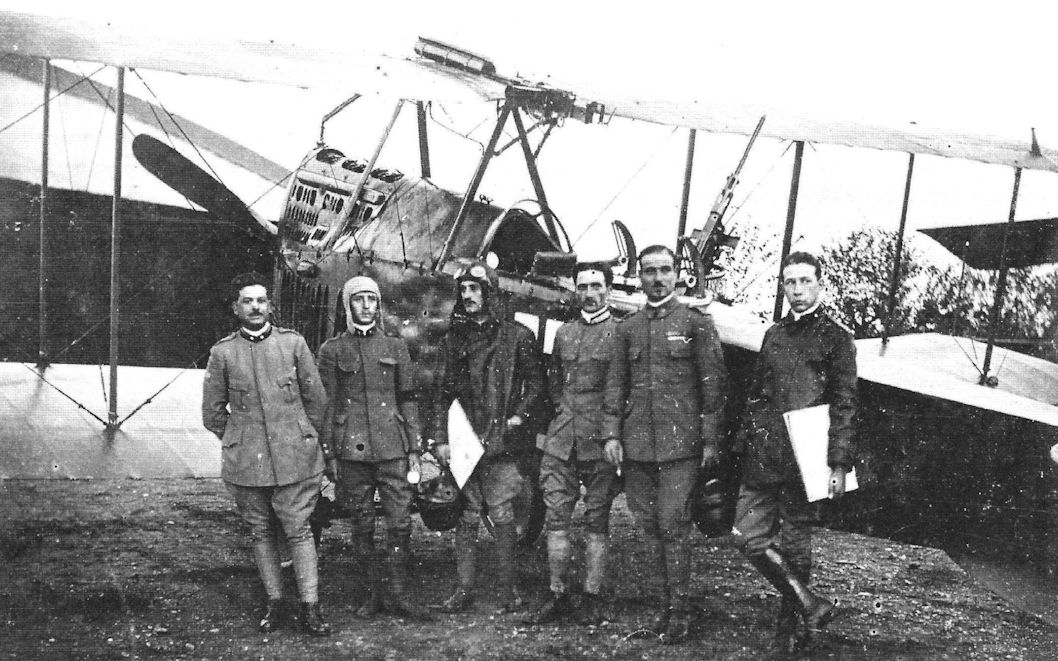 Farman MFC 2687 of the 50a Squadriglia. The pilot in the center is Amedeo Mecozzi, later a theorist of air warfare, opposed to the ideas of Giulio Douhet of strategic bombing and favoring ground attack tactical aircraft.
