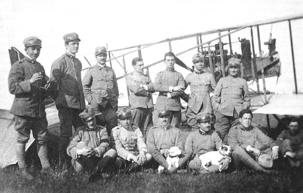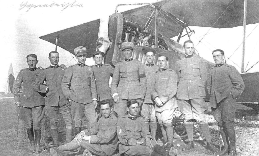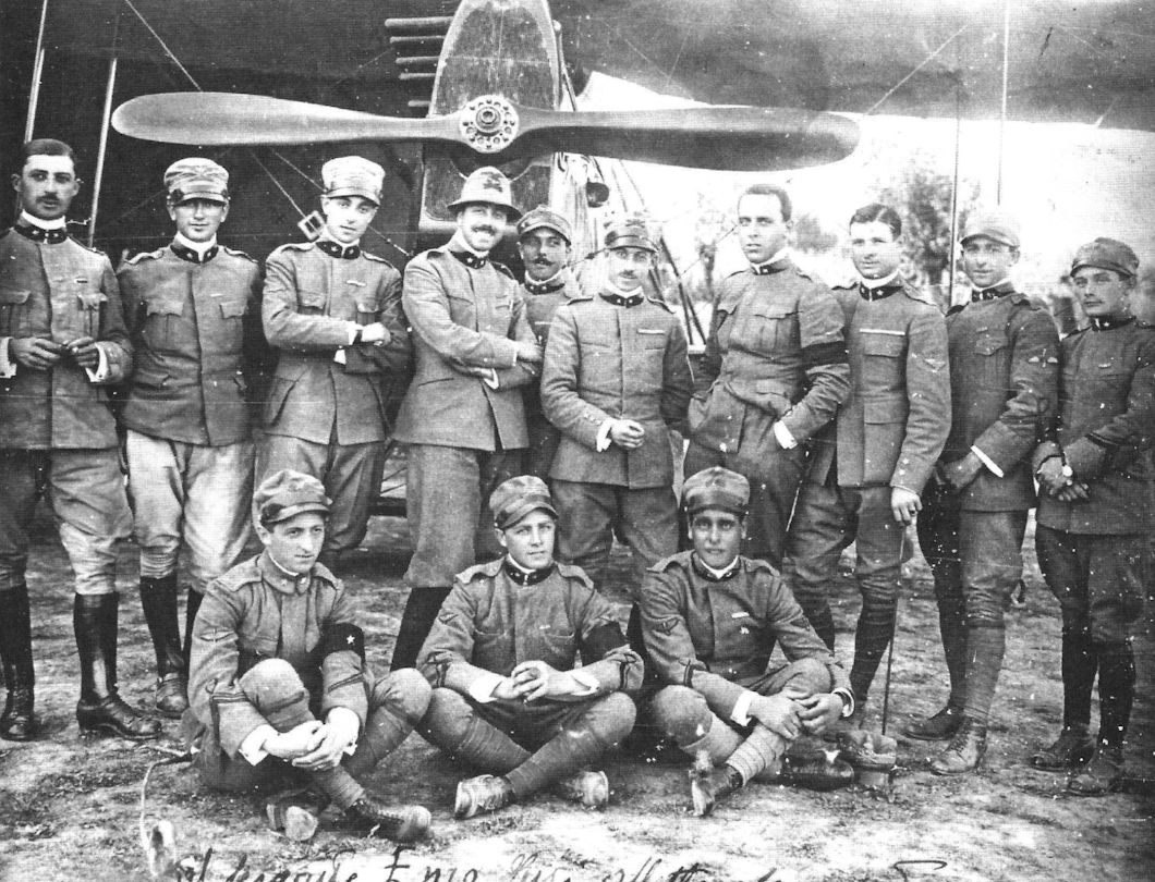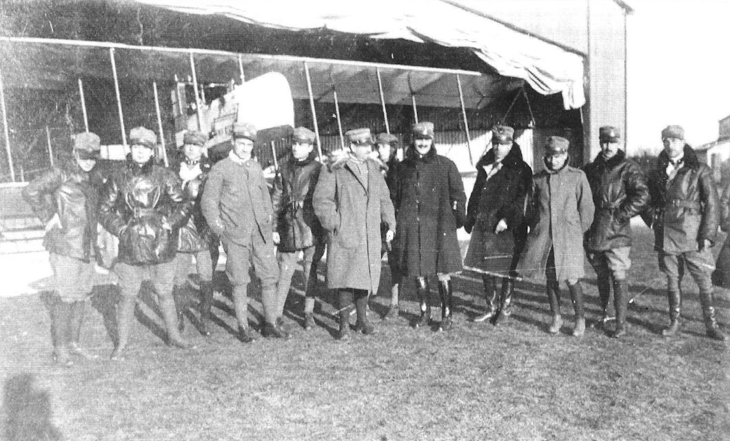 The aviators of the 26a Squadriglia. This photo was published in a magazine, so all the names are known; from the left: serg. Gaggero, sold. Cappellini, ten. Bonino, ten. De Notti, doctor Denza, s.ten. Aldi, ten. Manzini, s.ten. Cebrelli, cap. Lioce, cap. Bianchi, s.ten. Marangoni, ten. Contini, serg. Graziani, m.llo Radicchi, serg. Pasquali.