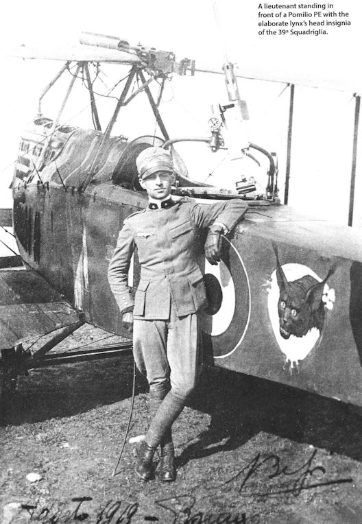 A lieutenant standing in front of a Pomilio PE with the elaborate lynx's head insignia of the 39a Squadriglia.