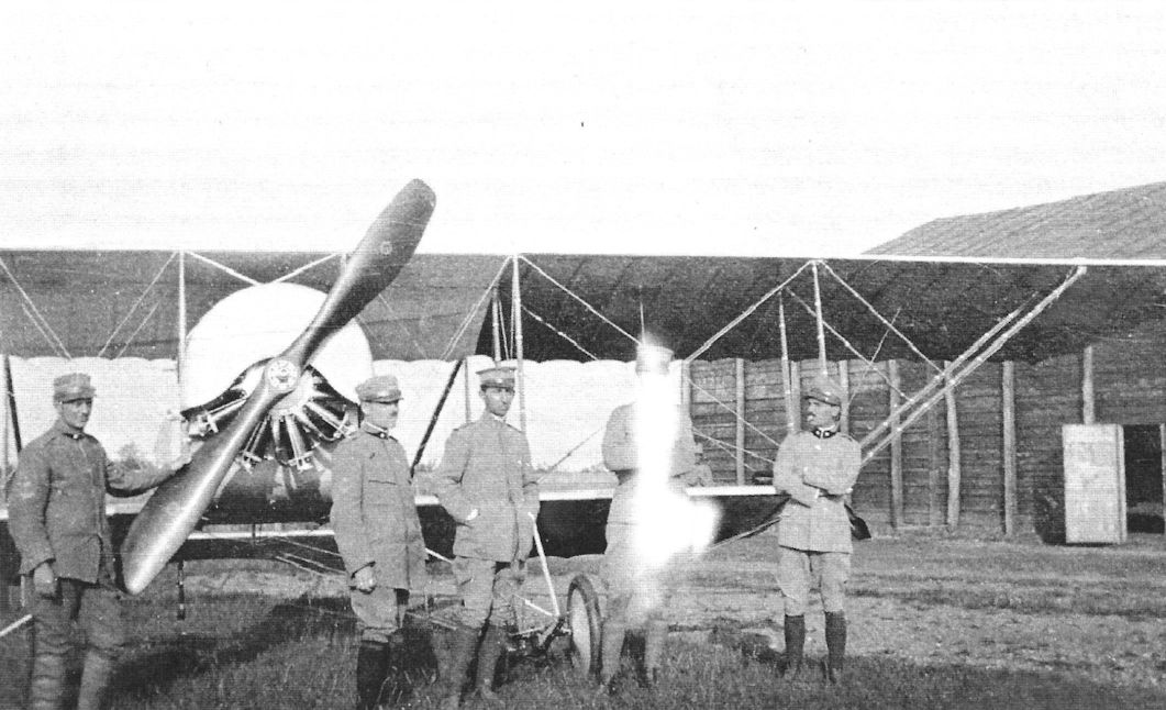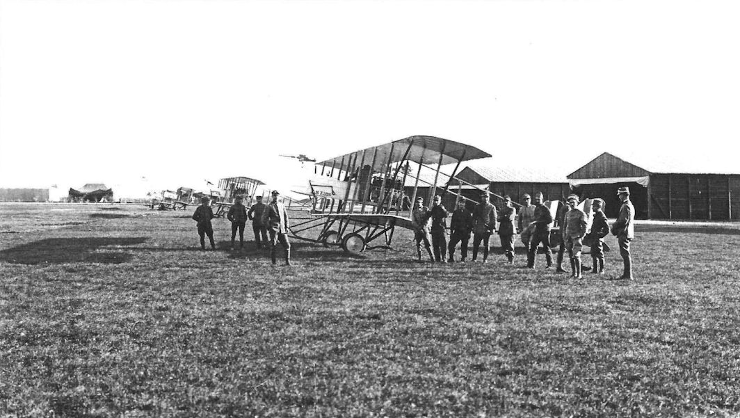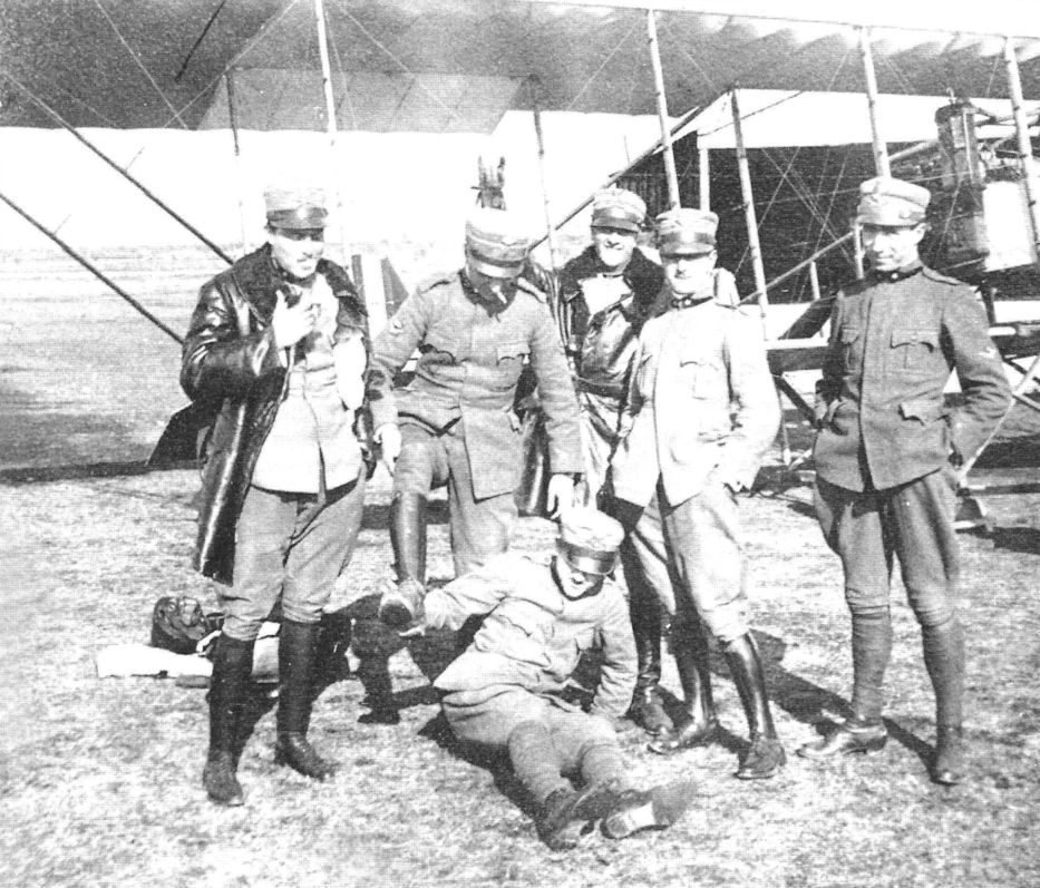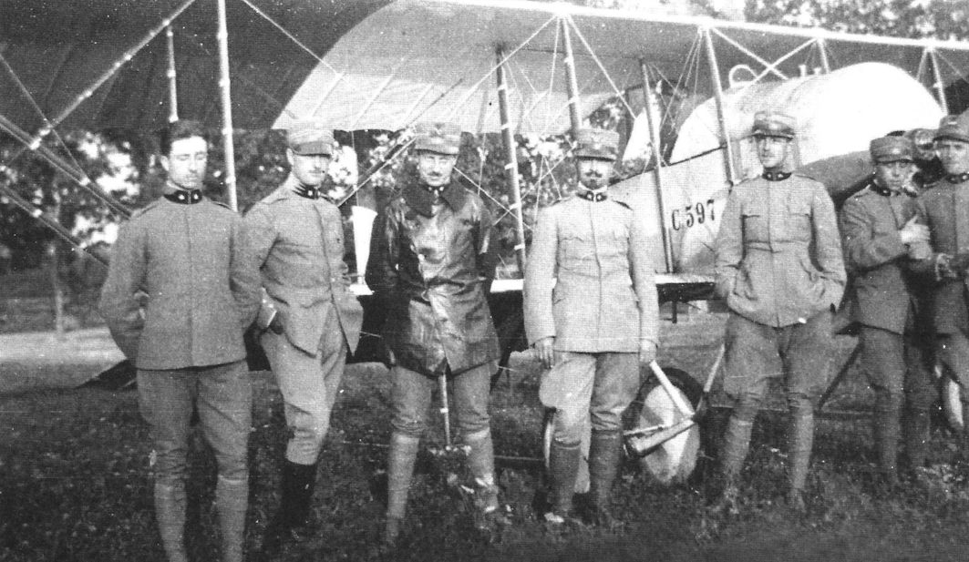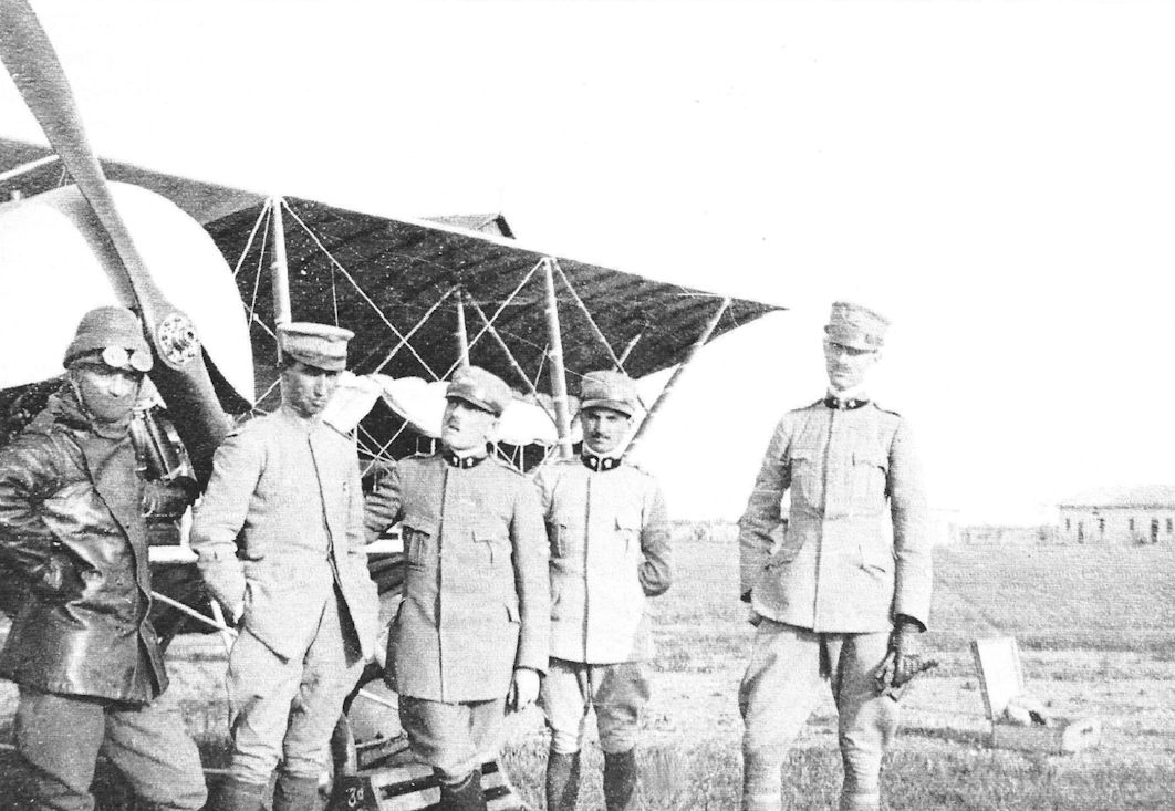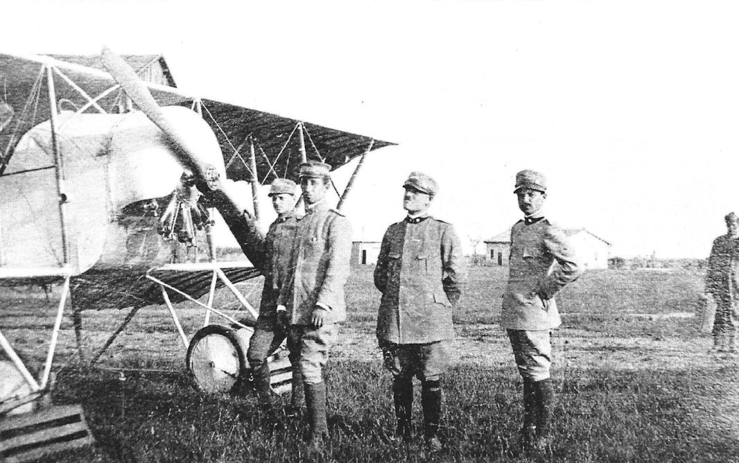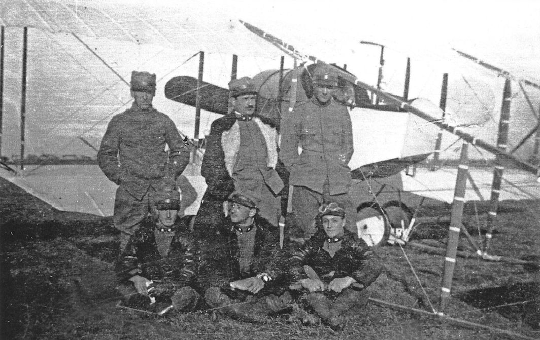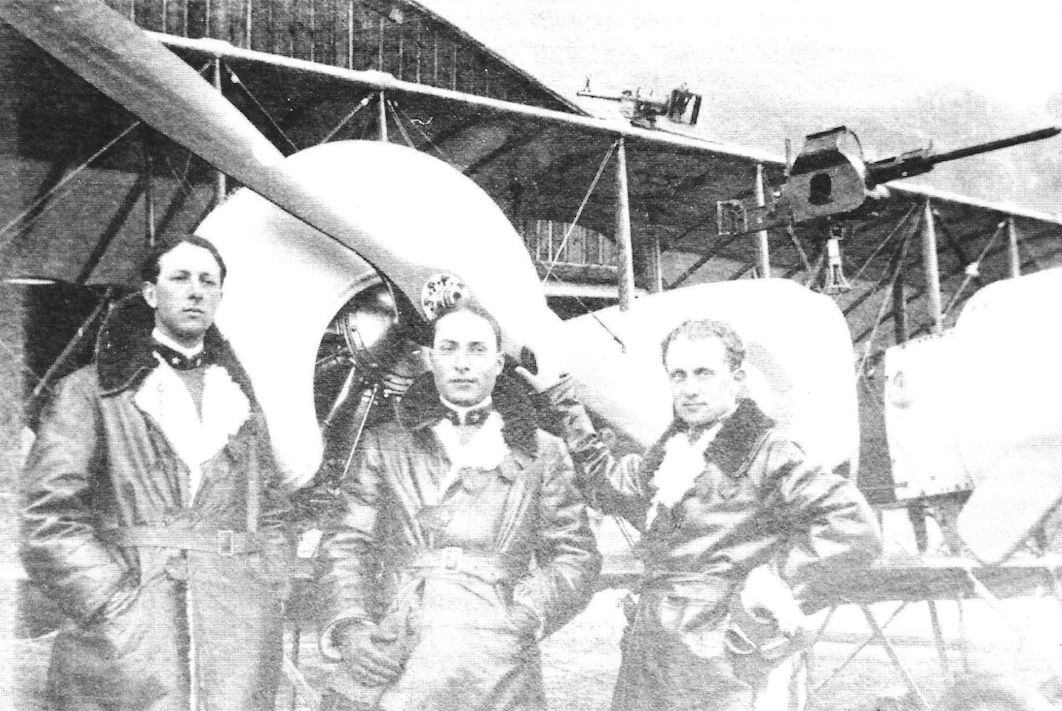Airmen of the 27a Squadriglia with Farman 771; the second is Carlo Adamoli, the third is Roberto De Anna, a volunteer from Mexico. (Archive Caliaro)