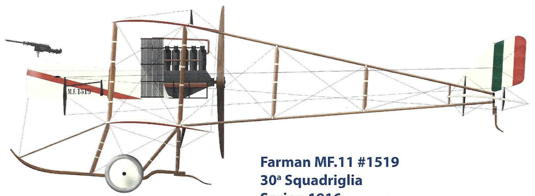 Farmans of the 30a Squadriglia; the first one seems to have some dark color on wings and tailplanes, while the other ones are in natural linen.