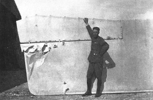 The wing of a PE with damage from enemy fire, 6 October 1918; pilot serg. Giacomelli, observer ten. Cela. (Cela - Europeana)