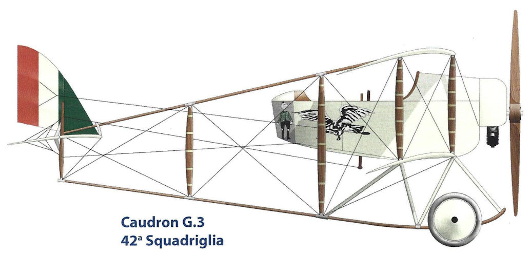 A Caudron G.3 of the 42a Squadriglia with some personal markings: the usual Happy Hooligan and an eagle.