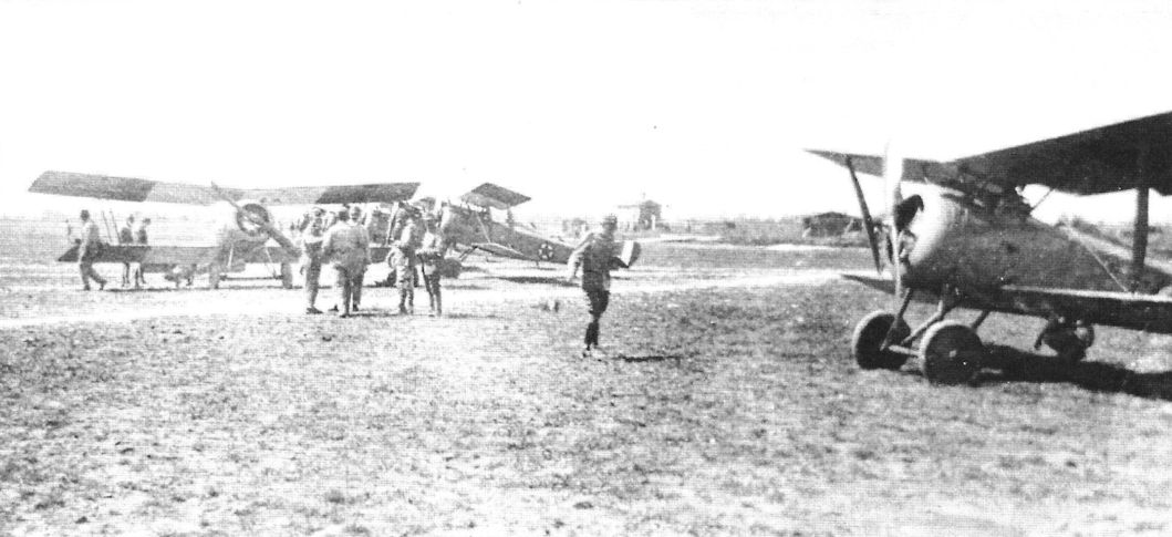 A Nieuport 11, an Hanriot, and a Nieuport 17 of the 82a Squadriglia at Padua. In the background there are three Capronis and two SVAs of the 87a Squadriglia.