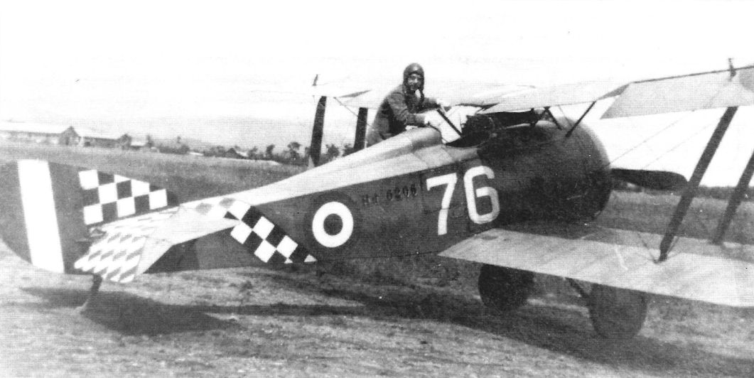 Magg. Vincenzo Lombard with his Hanriot with the insignia of Group commander. On the fuselage, where the 6 is, there is a fairing with holes, to drop bombs.