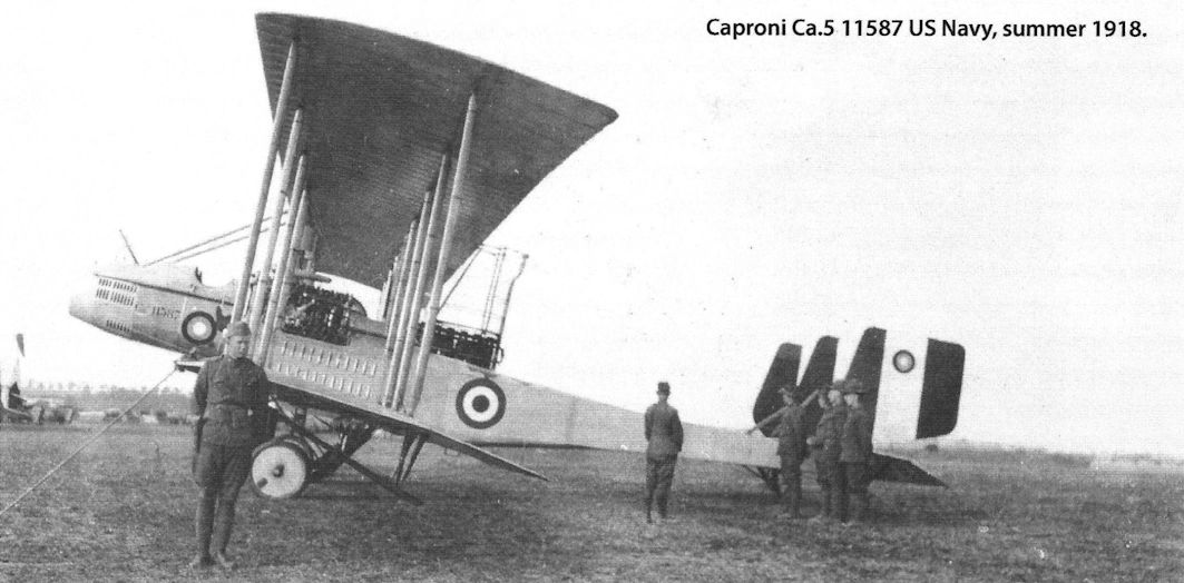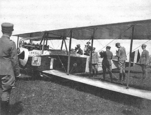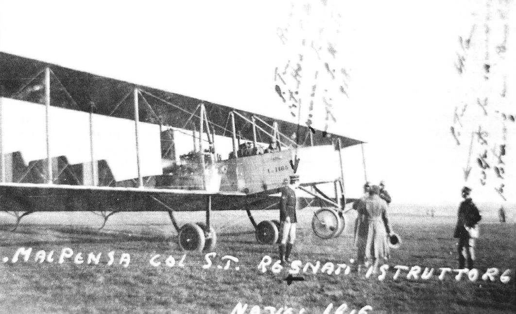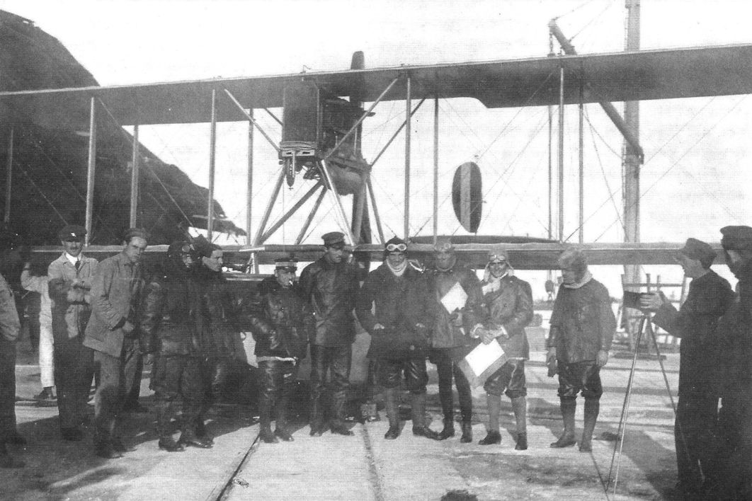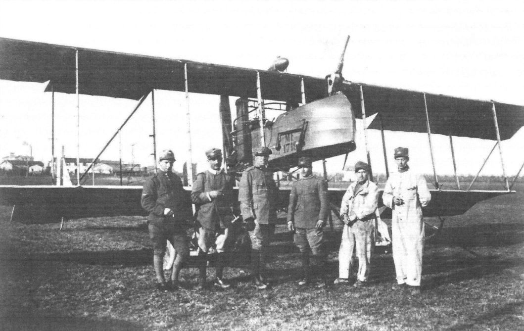 Caproni Ca.1 1165 at the Malpensa school. In the center is Silvio Resnati, who was killed in the crash of Caproni "Giulio Cesare" at Hazelhurst Field, New York, on 17 May 1918.