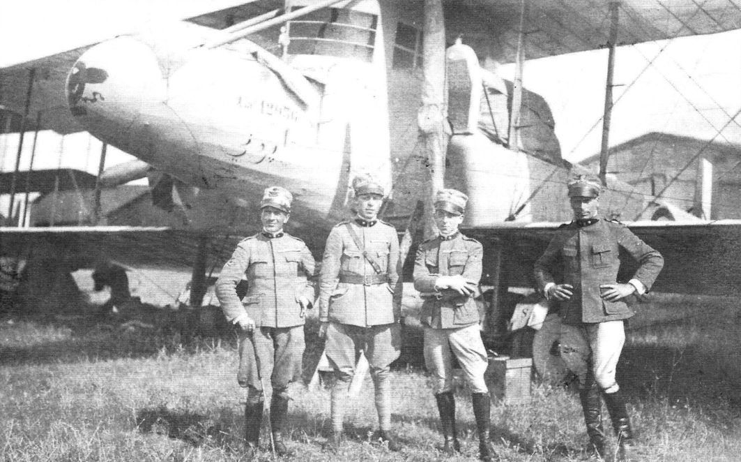 The pilots who bombed Innsbruck. From the left, Arrigoni, Orsini, Palma di Cesnola, and Palli. This photo was distributed to the press, but with the roundel and the rooster censored.