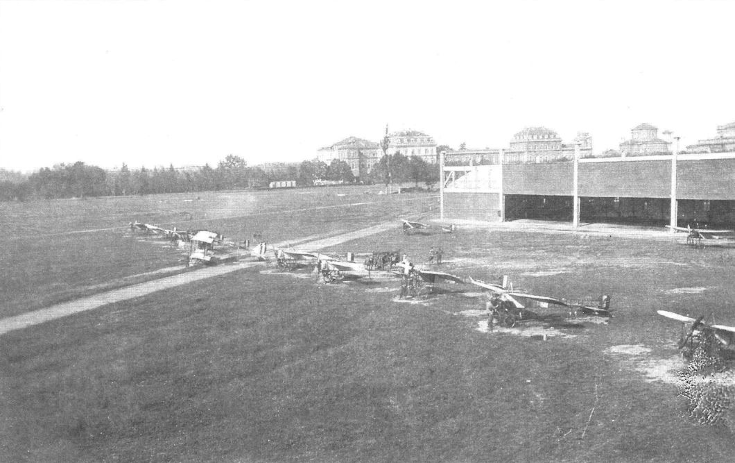 Nine Bleriots and a Farman at the flying school of Venaria Reale, with the royal palace as background. (Archive Achille Vigna)