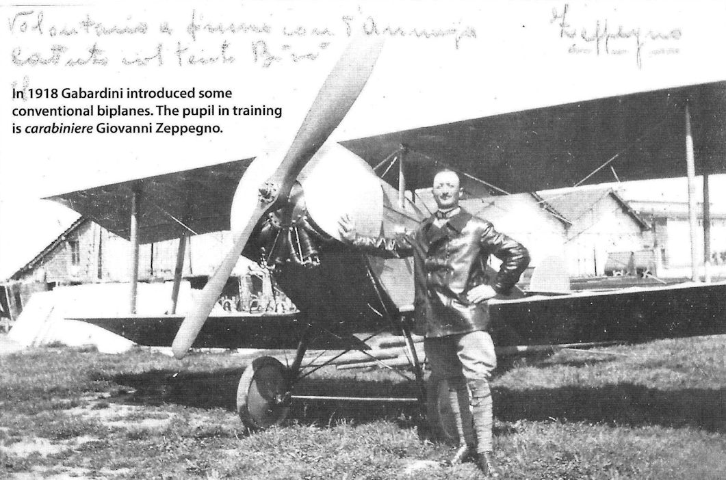 In 1918 Gabardini introduced some conventional biplanes. The pupil in training is carabiniere Giovanni Zeppegno.