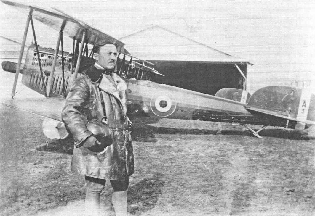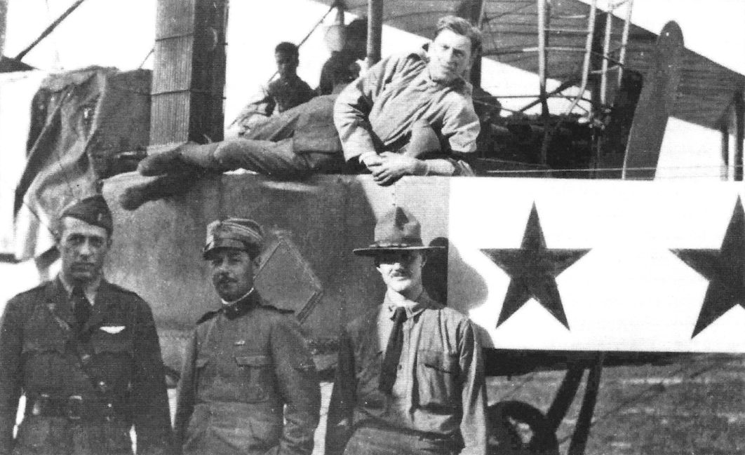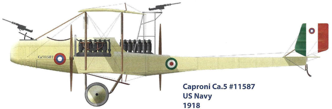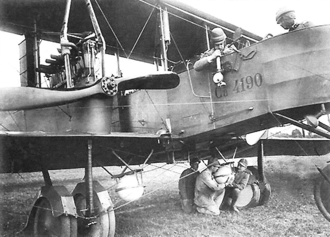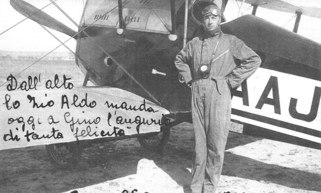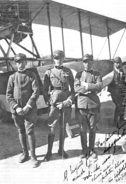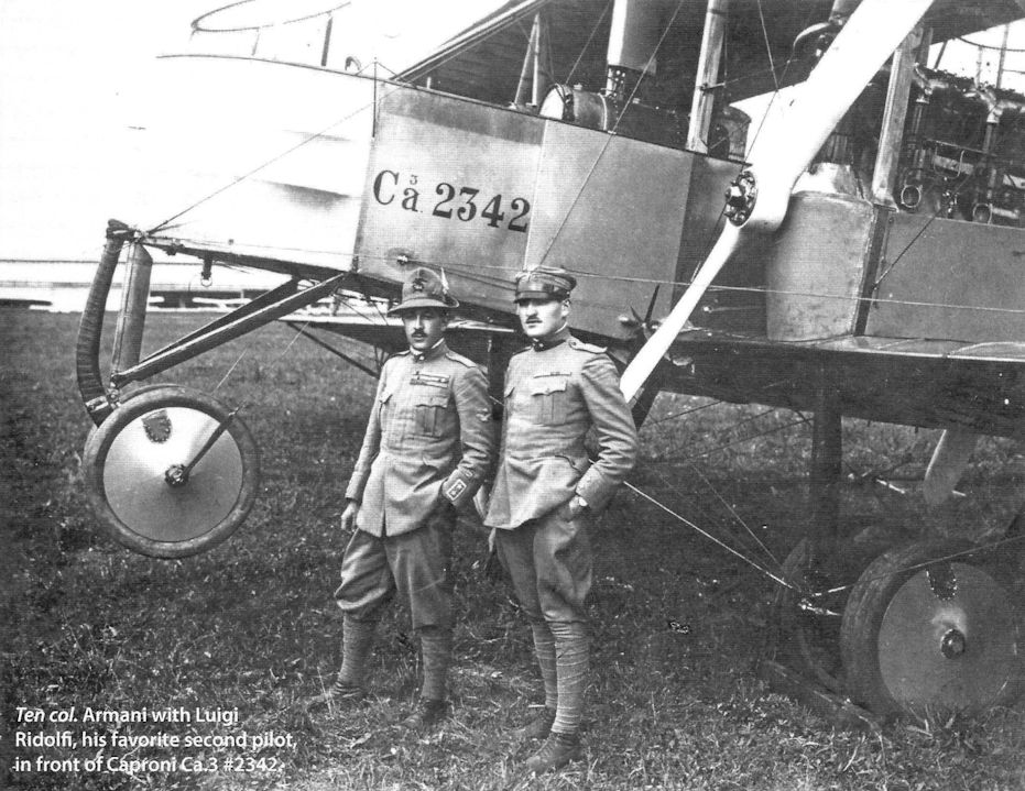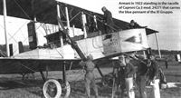 Armani in 1922 standing in the nacelle of Caproni Ca.3 mod. 24271 that carries the blue pennant of the XI Gruppo.