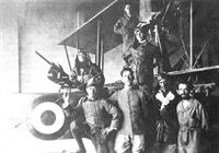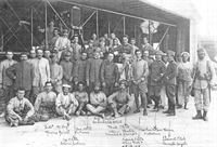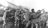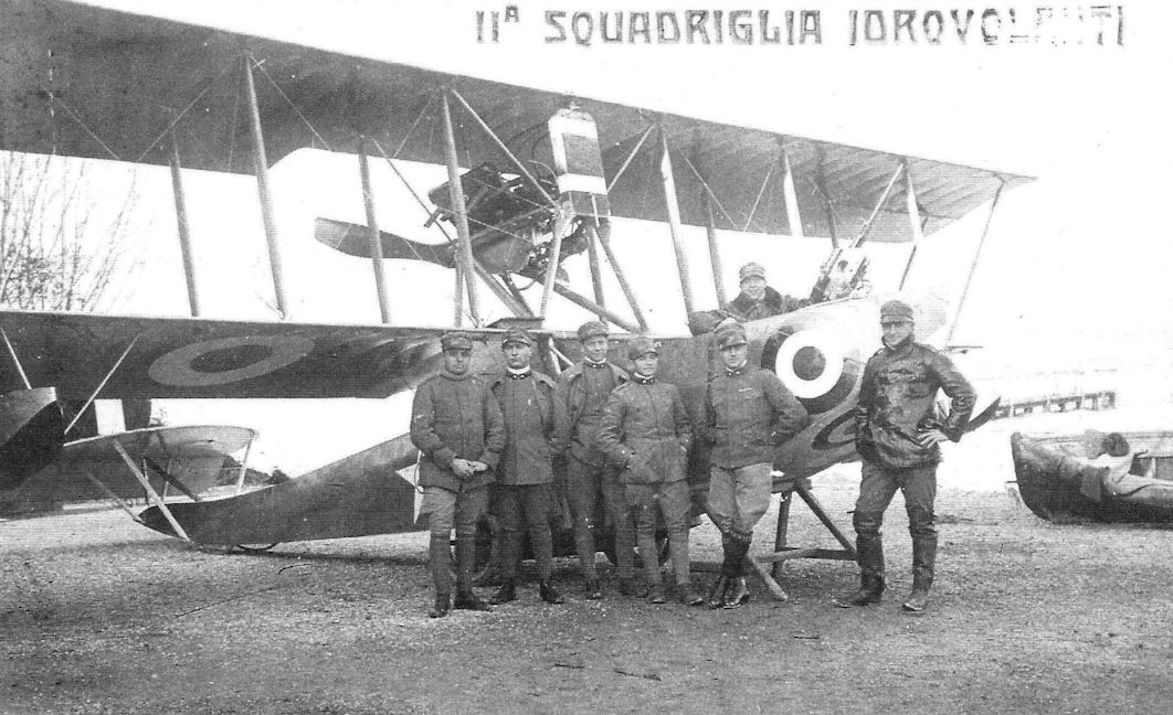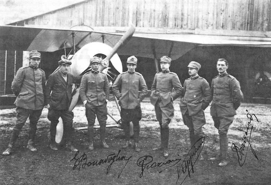 Pilots of the 76a Squadriglia in 1916: from the left, Stoppani, unknown, Bonavoglia, unknown, unknown, Appiani, and Arrigoni.