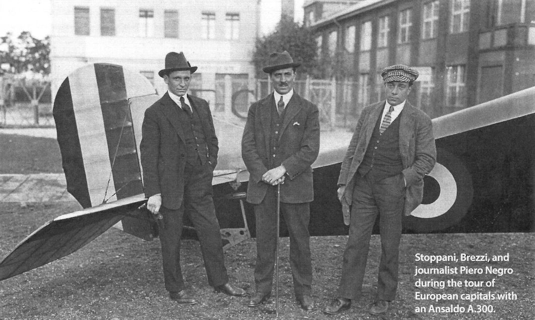 Stoppani, Brezzi, and journalist Piero Negro during the tour of European capitals with an Ansaldo A.300.