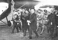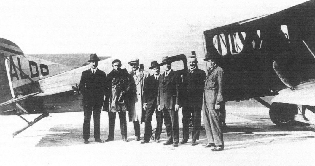 On 4 November 1923, authorities walk during the first parade of the newly born Regia Aeronautica. From the left: Admiral Thaon di Revel, Gen. De Bono, a fascist leader, Finzi, Mussolini, Arturo Mercanti, chief of civil aviation, behind them Italo Balbo. The airplane is a German Sablatnig P.3.