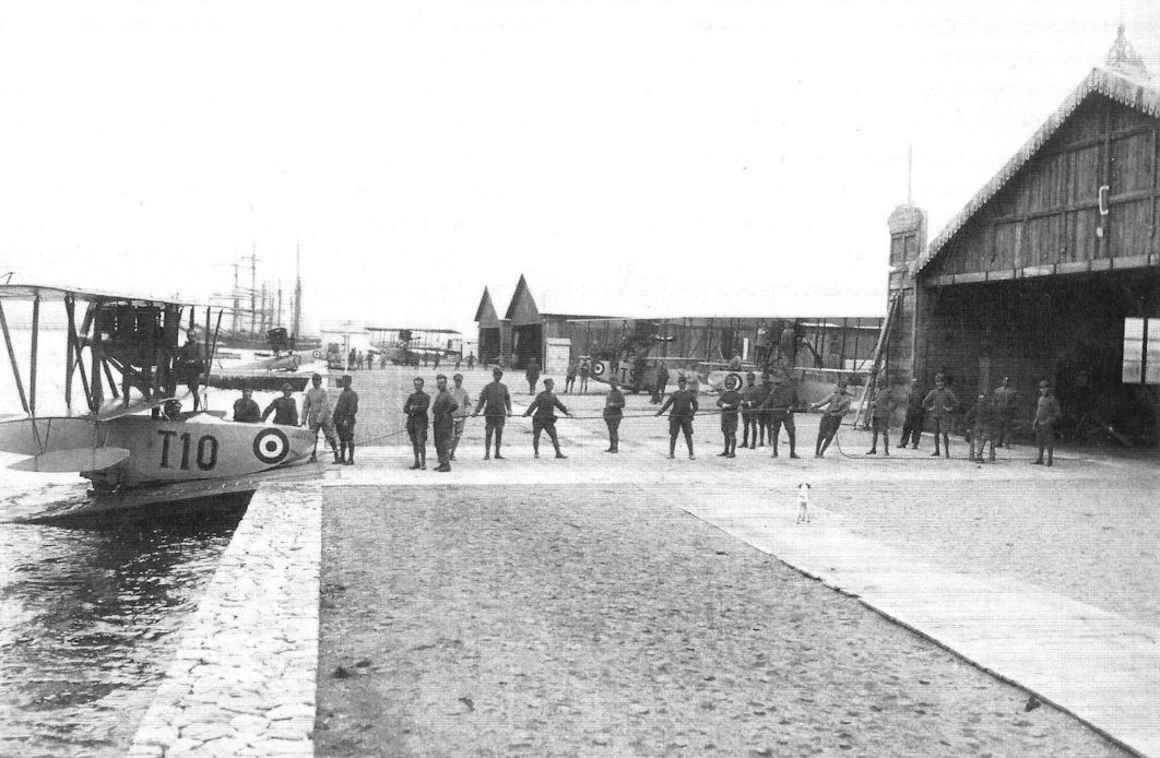 The naval air station at Trapani, home of the 284a Squadriglia, was large and well equipped. In the forefront, FBA 6481 "T10" of the 284a Squadriglia. (Collection Paolo Monti)