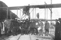 The airmen of the Brindisi Naval Air Station after a successful mission over Durazzo, 27 December 1917. Under the engine of the FBA, Orazio Pierozzi and Umberto Maddalena can be seen.